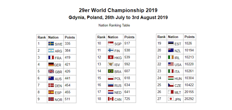 O Campeonato Mundial da Classe 29er, 2019 Zhik 29er Worlds, realizado em Gdynia, Polônia premiou o país com melhor desempenho. O critério utilizado foi o desempenho das três melhores duplas do país que deve conter pelo menos uma dupla masculina e uma feminina. A nação campeã foi a Suécia seguida da Argentina e França. O Brasil ficou na 14ª colocação.