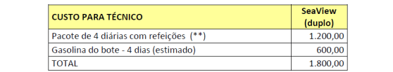 O custo para o técnico é composto pelo pacote de hospedagem mais os custos do seu bote de apoio, incluindo o combustível. A hospedagem (**) do técnico na pousada é opcional.
