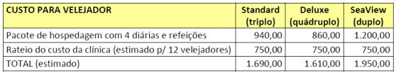 O custo para o velejador é composto pelo pacote de hospedagem mais os custos da clínica. O custo da clínica será rateado entre os velejadores e, portanto, o valor final depende da quantidade de velejadores participantes.